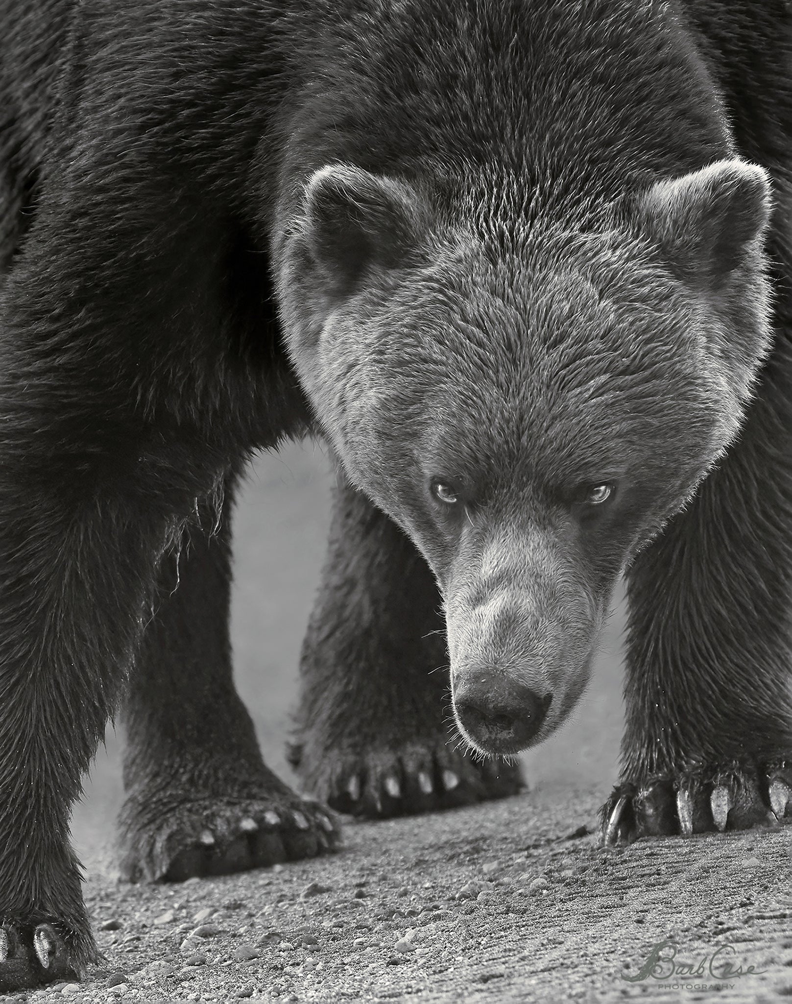 A female Alaskan Coastal Brown Bear female and her cub were fishing in Lake Clark National Park and Preserve while we observed them. A male Alaskan Coastal Brown Bear came over the berm along Cook Inlet and took this intimidating stance to scare the female. Especially close to hibernation, the males kill the cubs and impregnate the females. The shock of the loss of the cub causes the female to go into estrus which is the goal of the male bear. In this instance the female pulled the cub closer to the group I was with knowing that the males avoid humans. Her tactic worked as the male eventually left the area.
