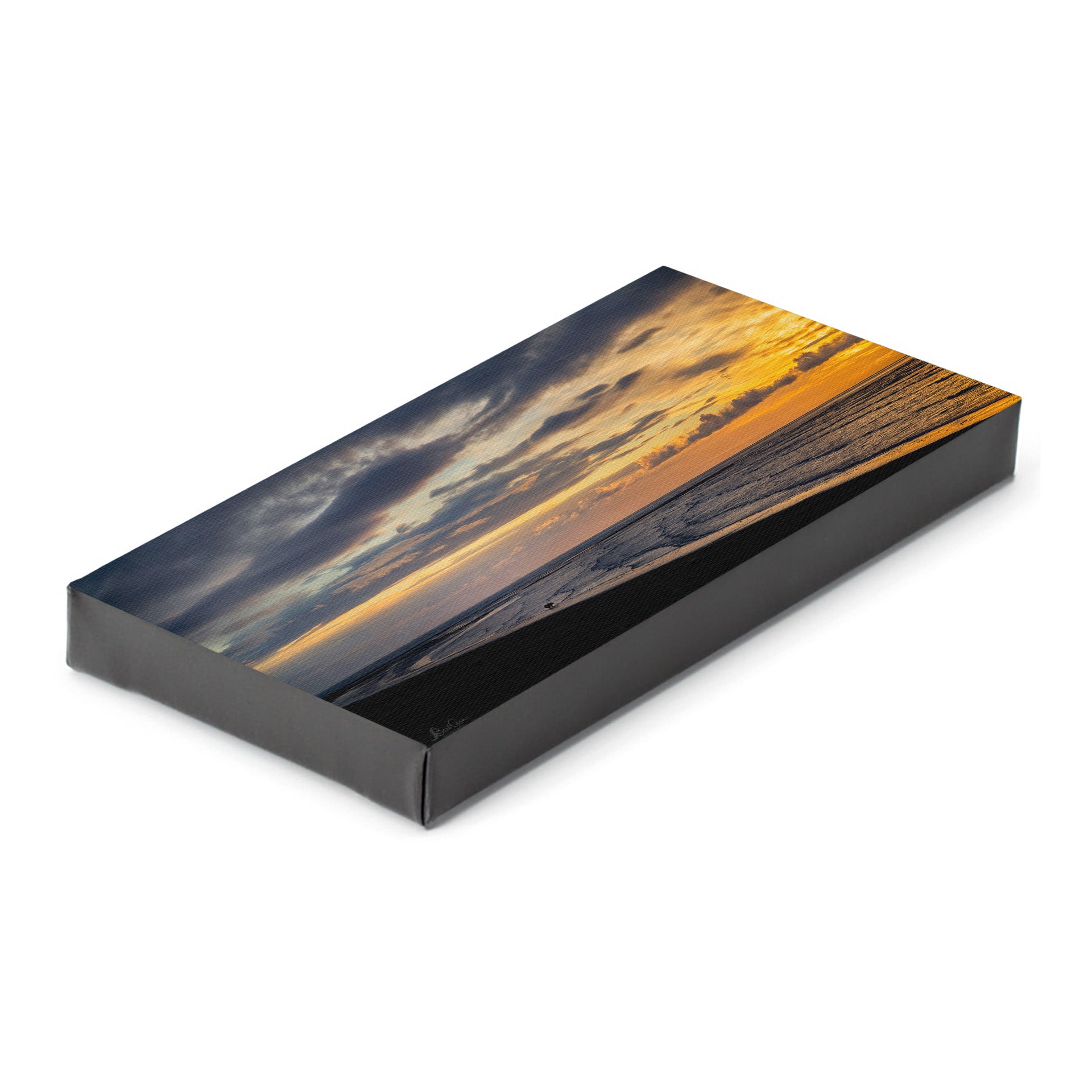 Canvas, with an archival quality that remains for up to 100 years as long as the print is not kept in direct sunlight, is stretched around a wooden frame and stapled on the edges (on the back) leaving the full image visible on the front. Canvas has a wire hanger on the back.