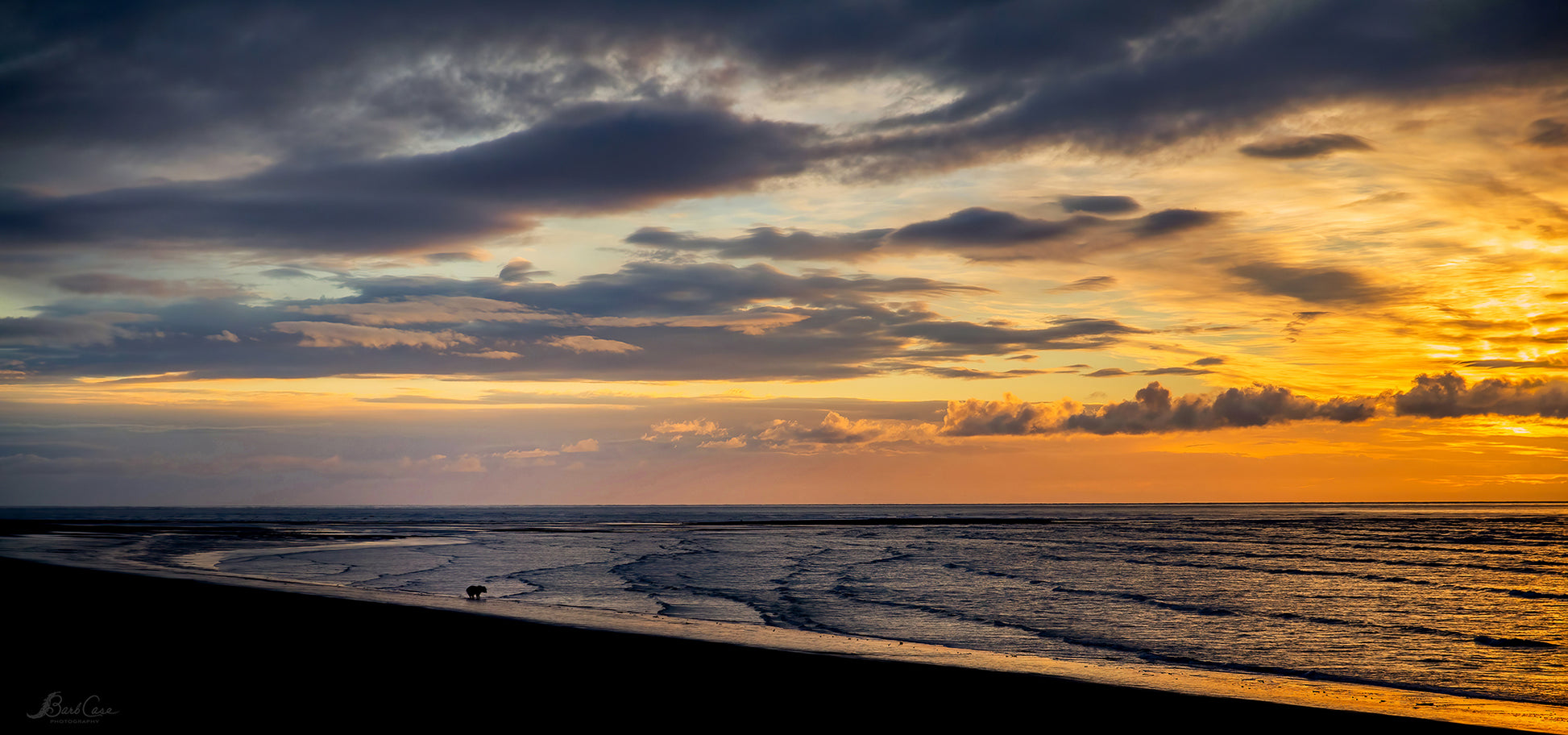 Alaska sunrises are among the most beautiful in the world. This sunrise over Cook Inlet along the coast of Lake Clark National Park and Preserve is proof of that beauty. An Alaskan Coastal Brown Bear clams along the shore.